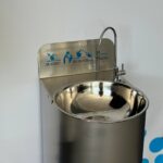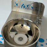 Drinking fountain – a metal structure made of food-grade stainless steel with gently rounded corners and a contoured bowl designed to minimise water splashing during use.