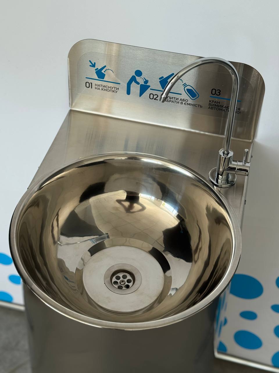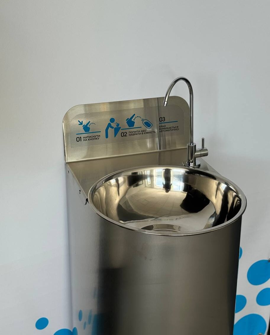 Drinking fountain – a metal structure made of food-grade stainless steel with gently rounded corners and a contoured bowl designed to minimise water splashing during use.